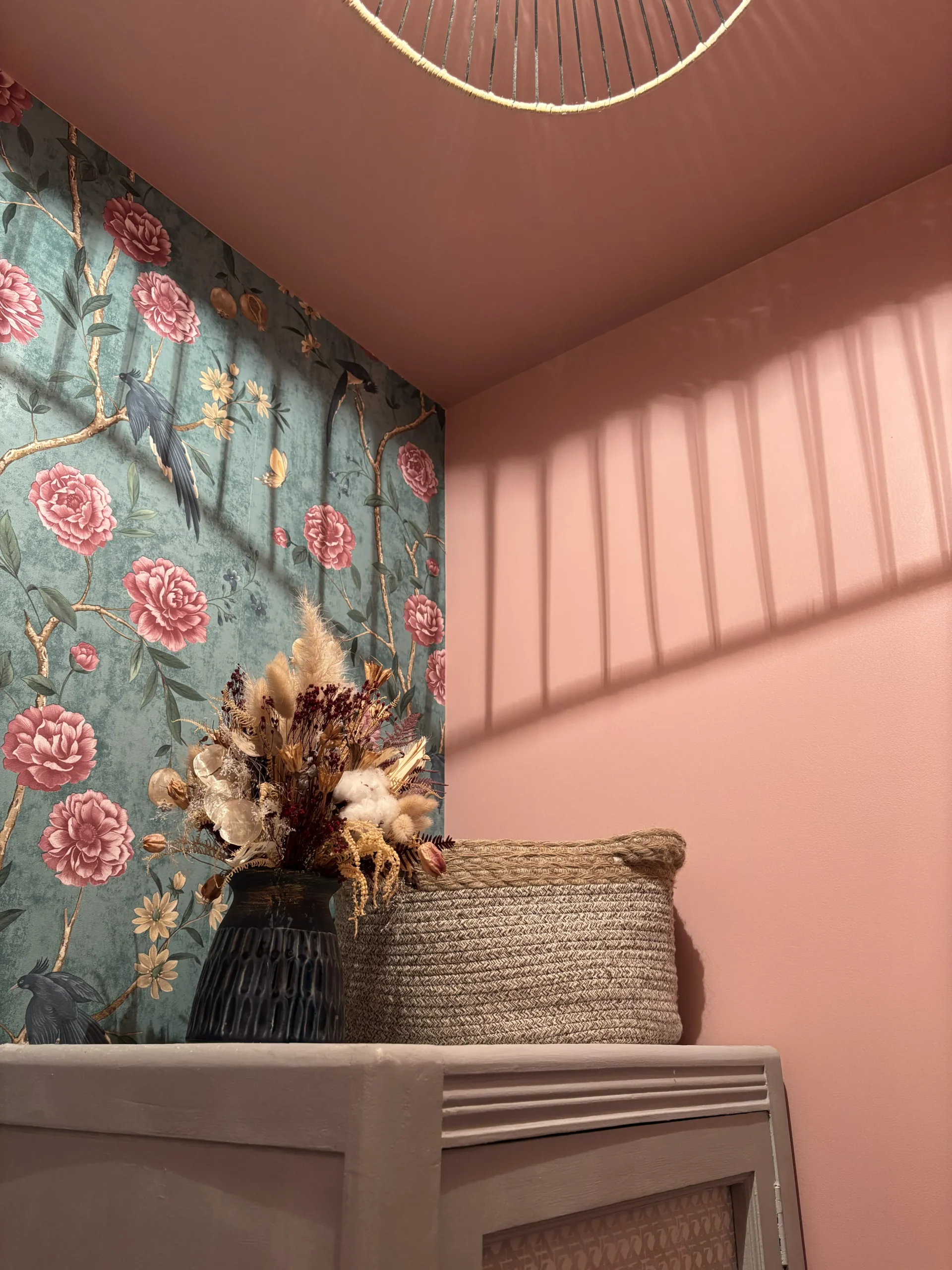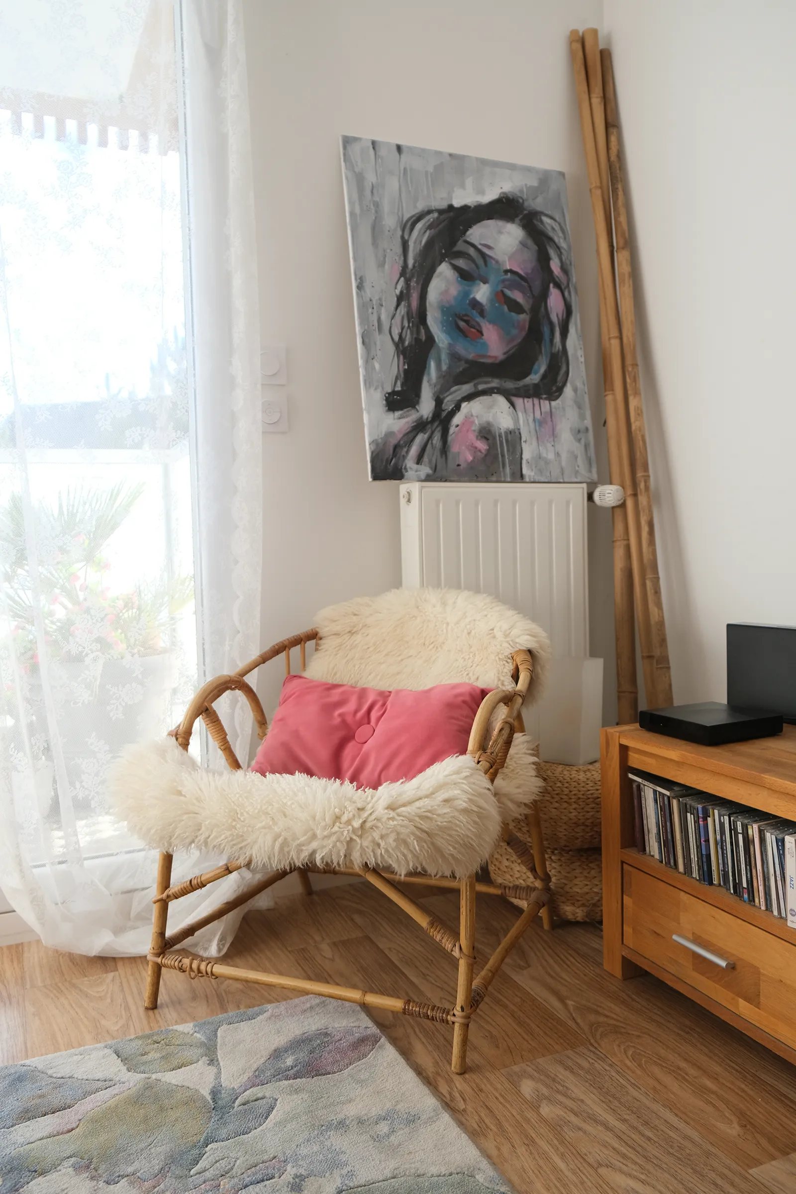 Le fil conducteur du projet ? Un tapis, découvert ensemble lors d’une après-midi d’aide shopping déco. Un coup de cœur immédiat. Ses couleurs, ses motifs m’ont guidé pour la palette de l’appartement, insufflant chaleur, rythmes floraux et cohérence à chaque pièce. Autour de lui, nous avons composé un cocon artistique, fait de détails choisis, de contrastes et d’une douceur assumée.