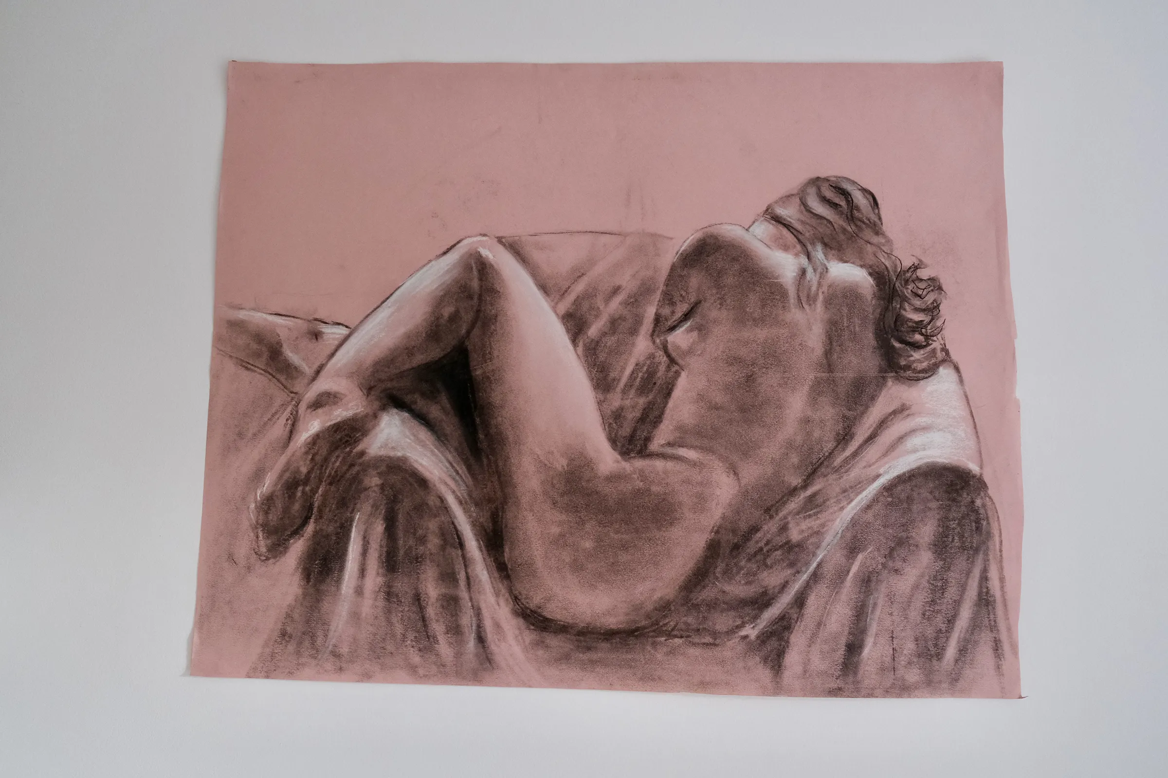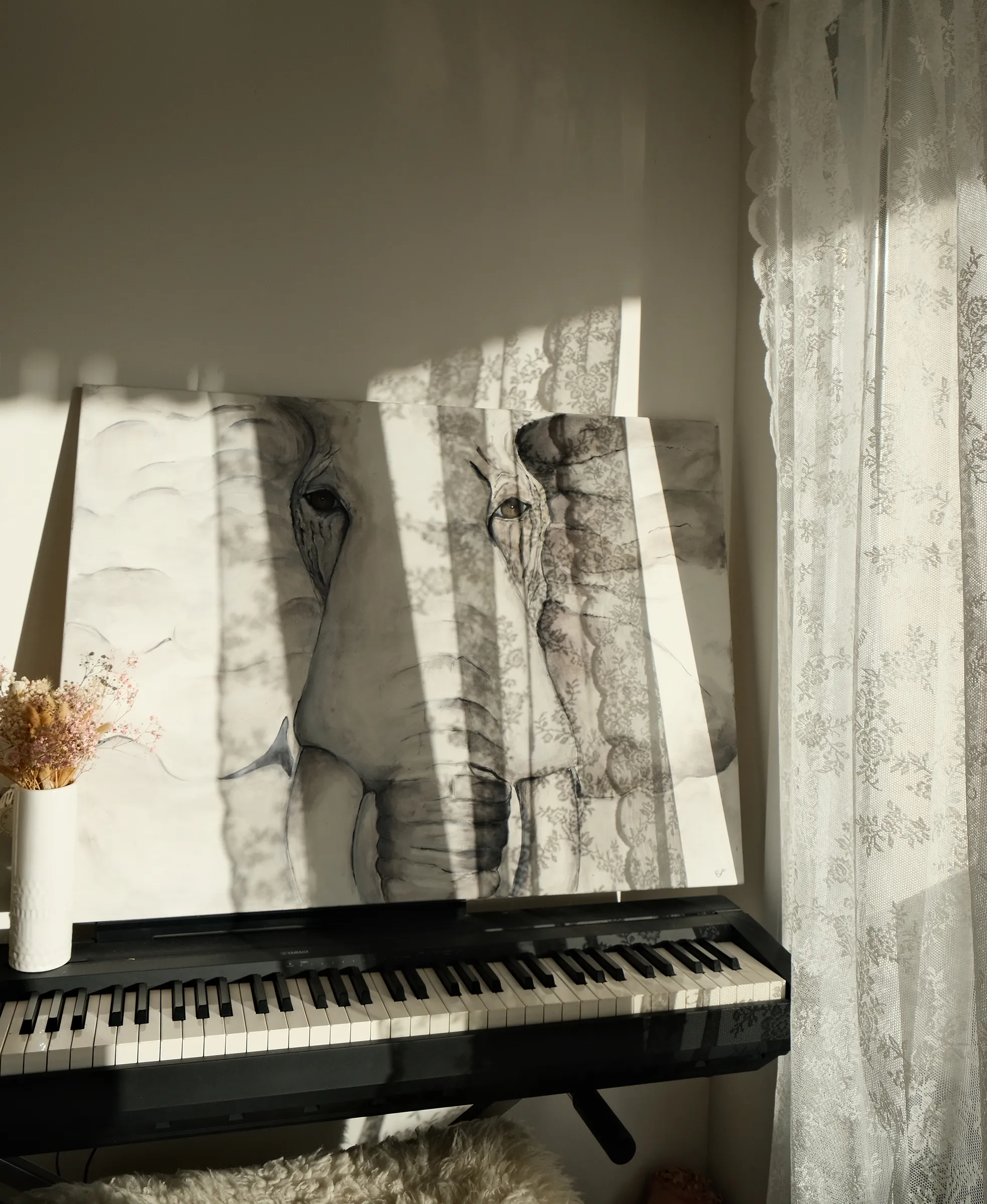 Ici, les peintures et les sculptures d’Eve ne sont pas de simples objets : elles dialoguent avec l’espace. J’ai pensé la lumière comme une complice, glissant sur les toiles, se reflétant sur les matières, révélant les reliefs et les nuances au fil de la journée. Une cheminée à l’esprit haussmannien, chinée, ancre le lieu, lui donne une élégance intemporelle, tandis qu’un miroir doré, chiné avec soin lui aussi, agrandit les perspectives.
