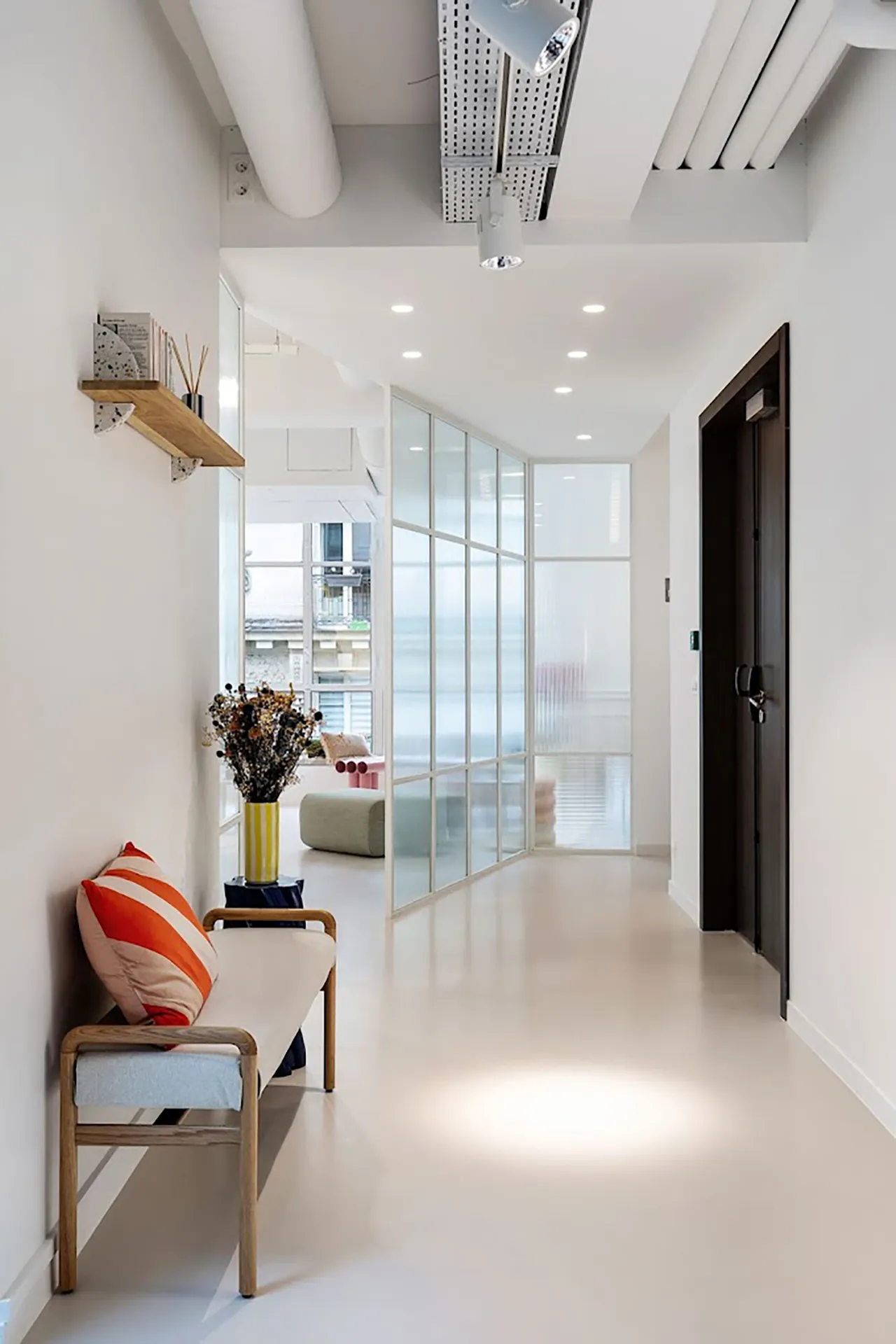 L’enjeu principal consistait à structurer l’espace sans le cloisonner, en conservant la fluidité et la transparence. Les verrières en verre flûté permettent de délimiter les zones tout en laissant passer la lumière.