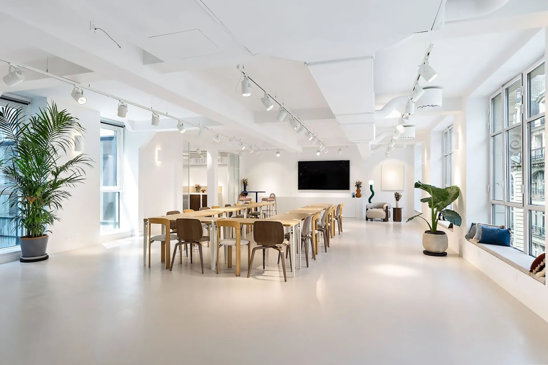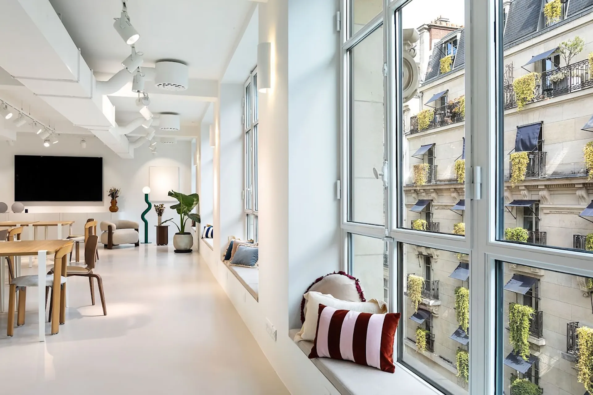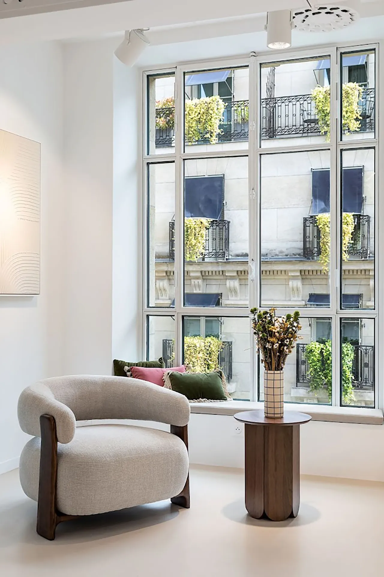 Installé dans un immeuble parisien aux grandes huisseries, cet espace entièrement vitré est baigné de lumière naturelle tout au long de la journée et offre une vue sur la rue Bachaumont, emblématique du cœur de Paris.