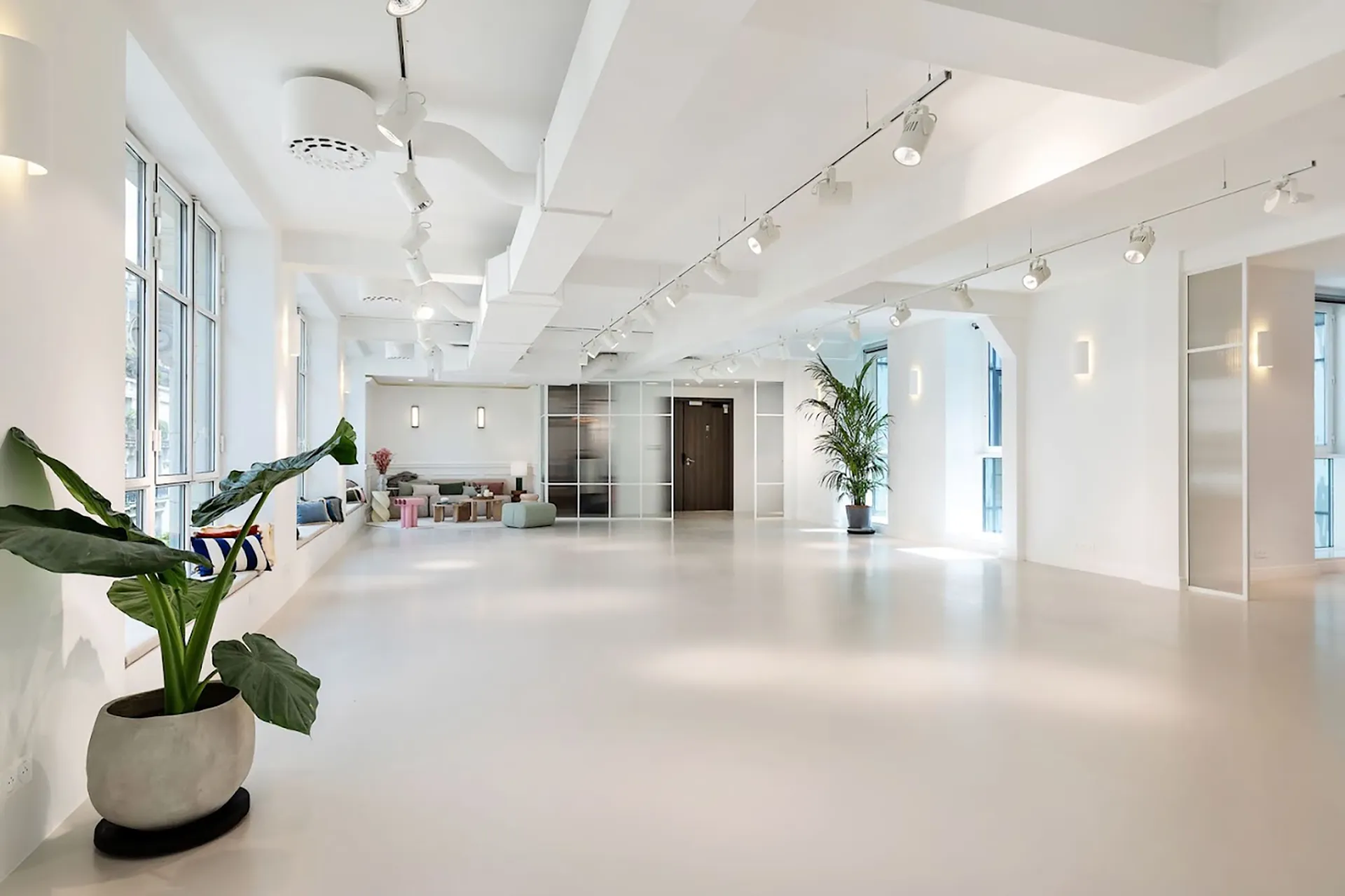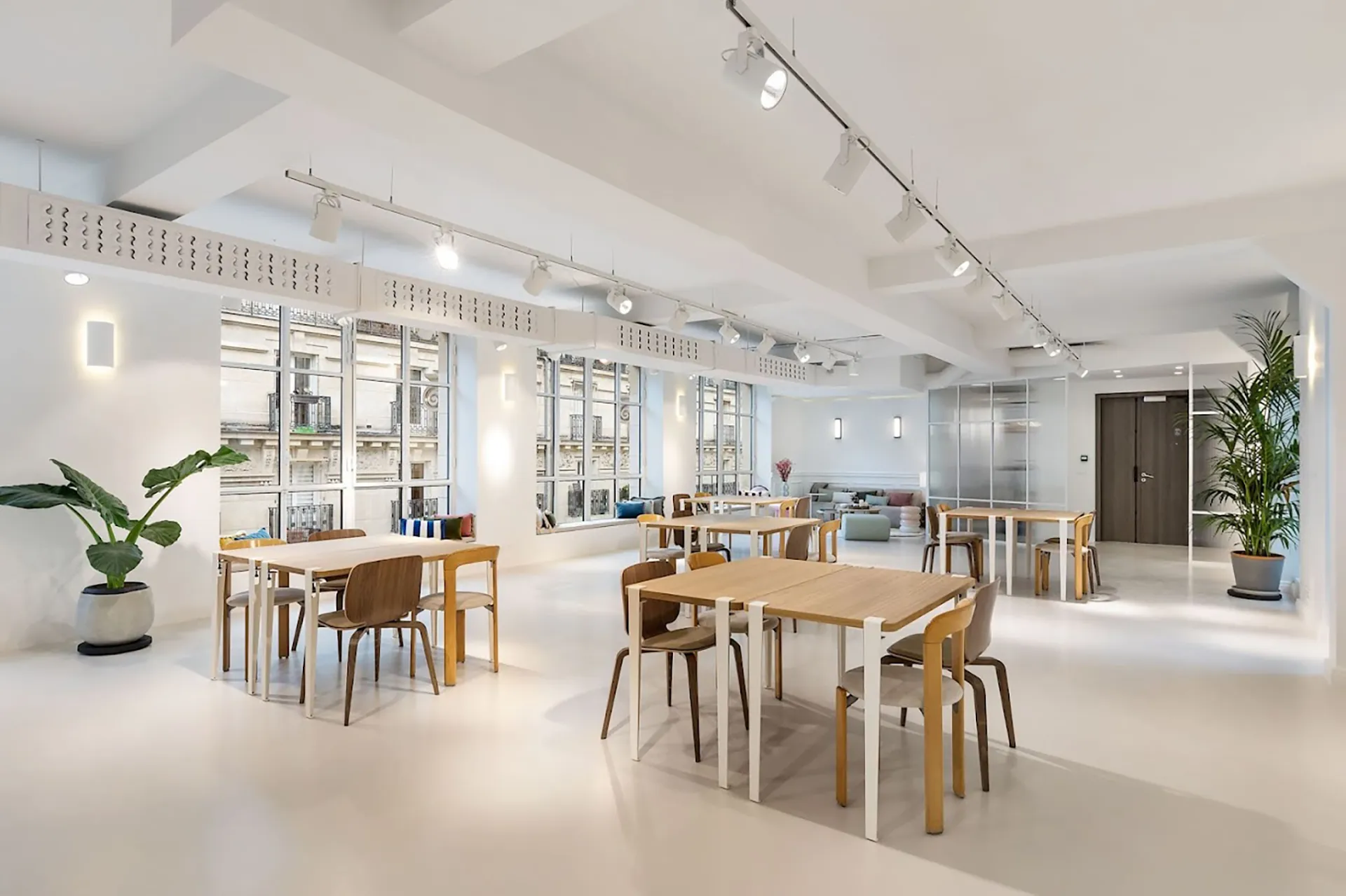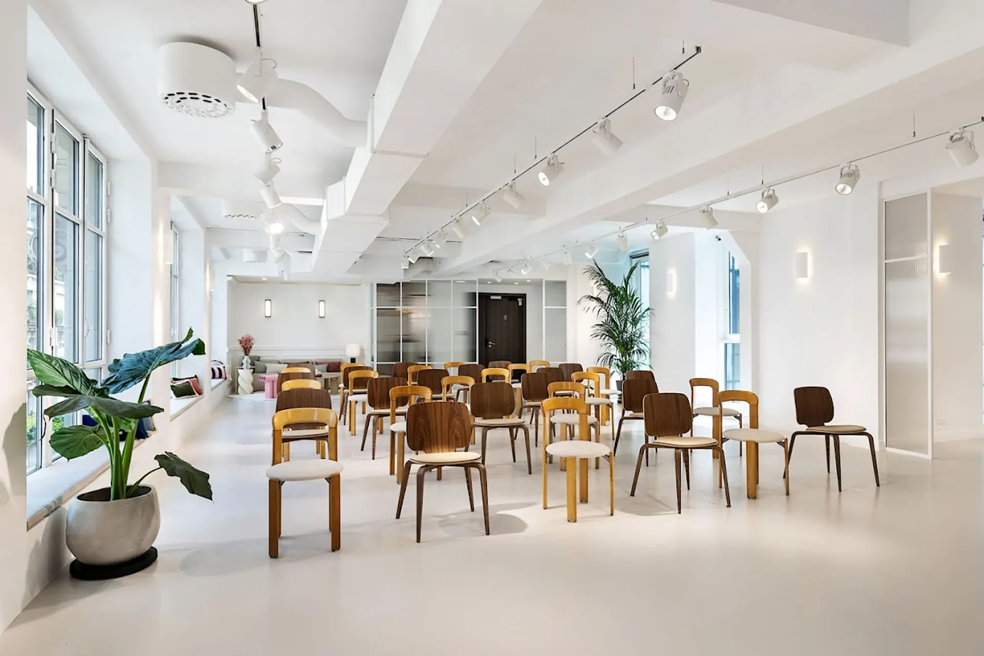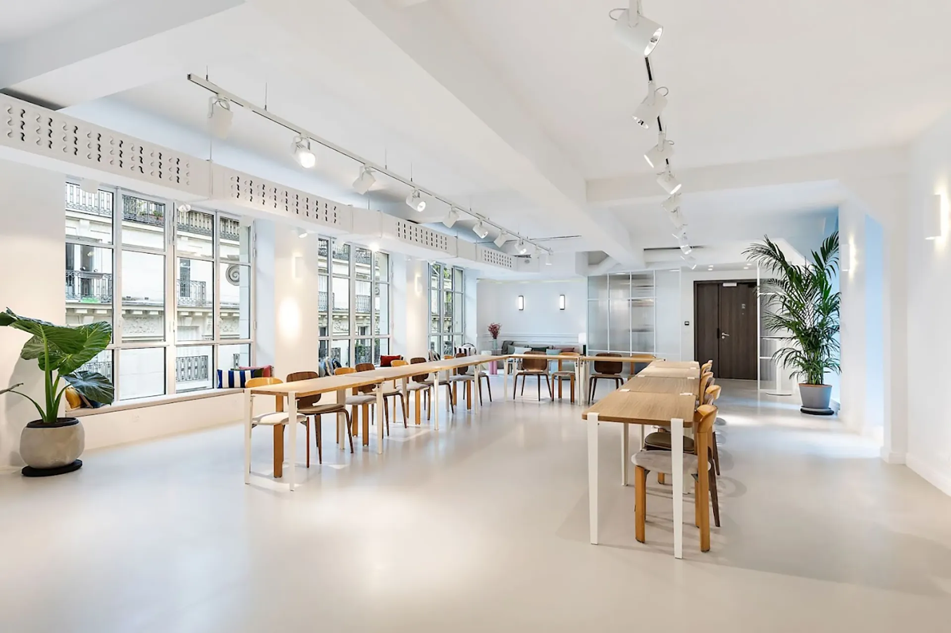 Installé dans un immeuble parisien aux grandes huisseries, cet espace entièrement vitré est baigné de lumière naturelle tout au long de la journée et offre une vue sur la rue Bachaumont, emblématique du cœur de Paris.