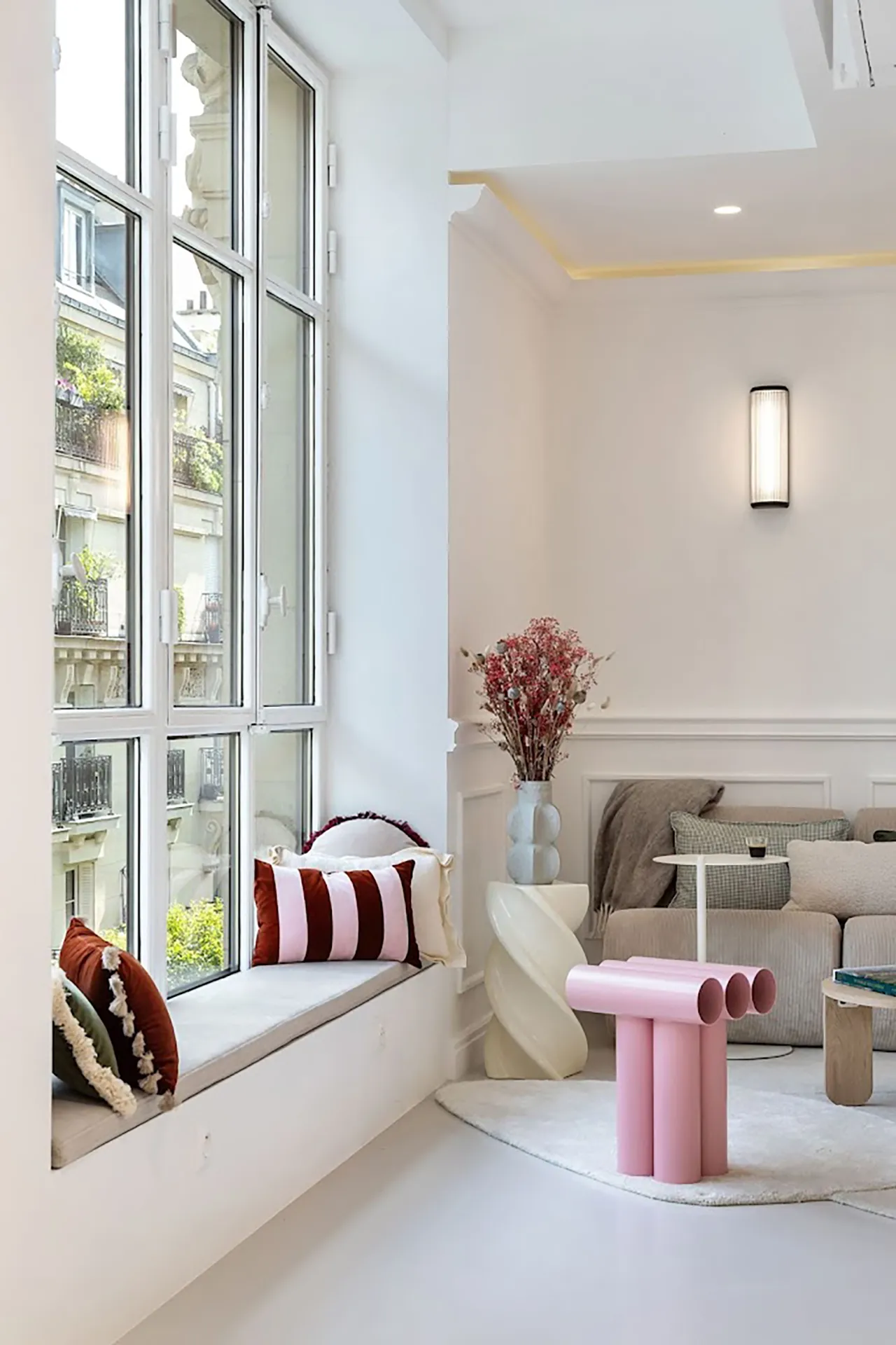 Nous avons choisi des pièces iconiques: chauffeuses vintage Maison Jeudi, suspensions en bois Junit de Shneid Studio, lampe Straw Zigzag designée par la créatrice française Julie Lansom, tabouret métallique rose Axel Chay, tabouret Moustache, maison d’édition de design française engagée basée à Paris. Des éléments pop et colorés viennent aussi agrémenter l’espace avec un jeu de frises en papier peint Mues design, des tapis et coussins Color Therapis, des coussins décoratifs de la marque portugaise Opala, ou encore des appliques murales Swedish Ninja, studio de création Suédois.