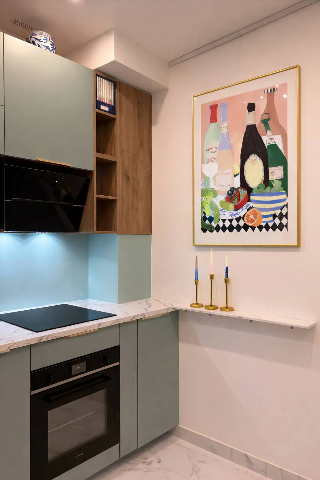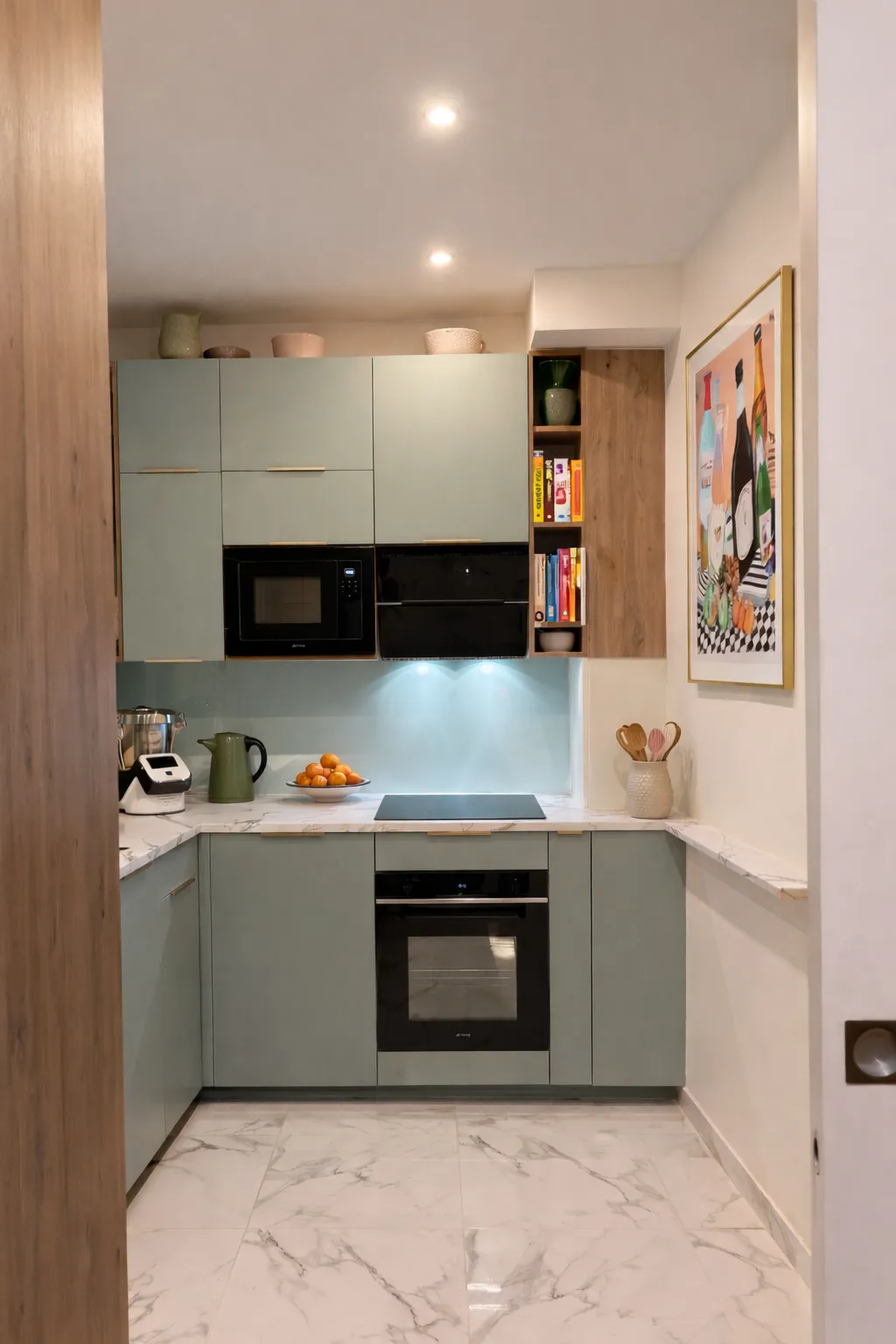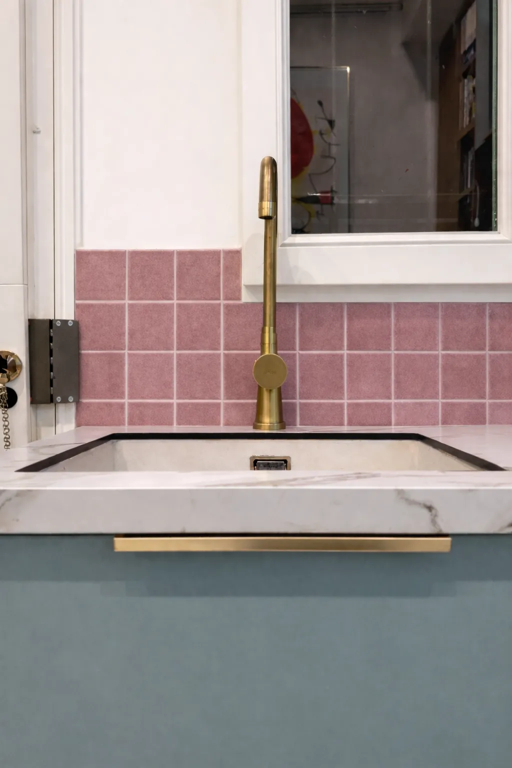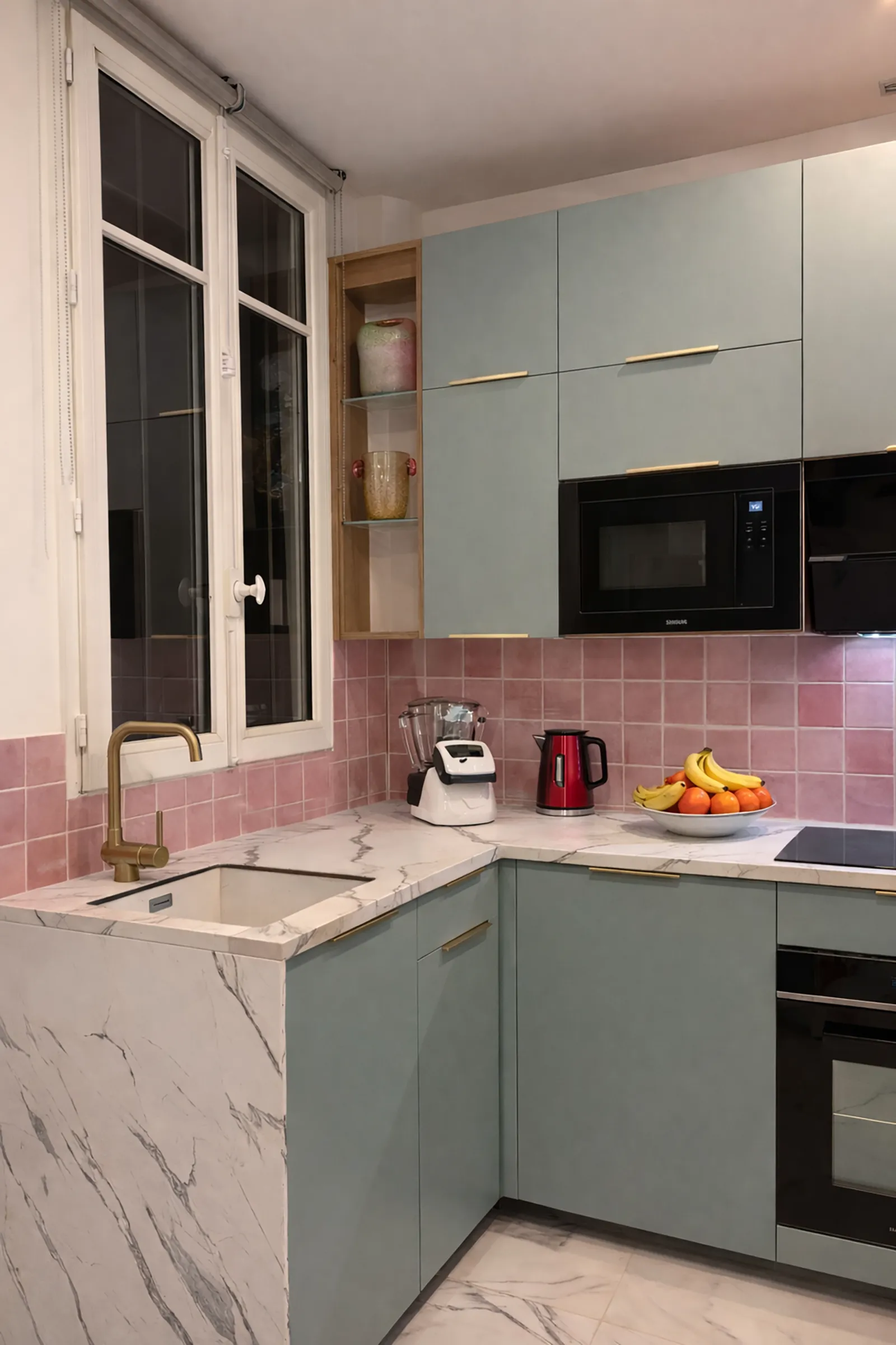 Des façades vert d’eau, qui dialoguent avec une crédence en carreaux cirés, façonnés à partir de sédiments marins et de pigments naturels: une matière vivante, presque minérale. Le marbre blanc apporte de la lumière, le noyer réchauffe l’ensemble. Le mitigeur doré a été chiné dans une brocante parisienne, patiné par le temps.