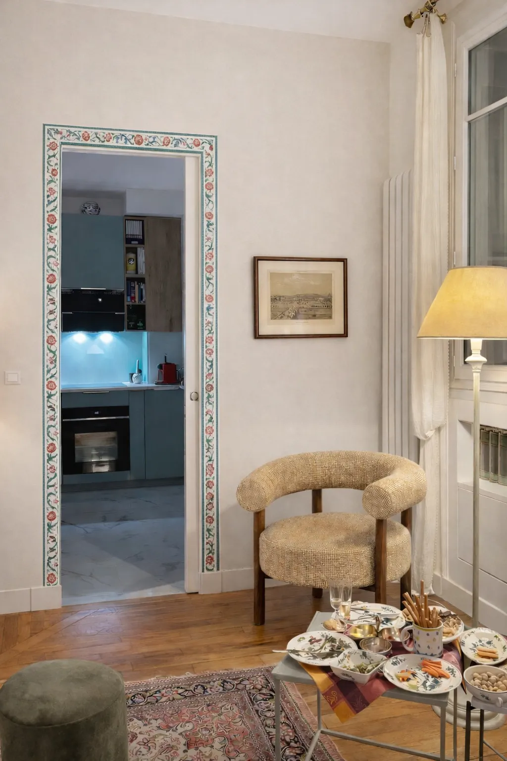 Autour de l’ouverture de la porte à galandage, j’ai fait poser une frise, comme un trait d’union entre les deux pièces. Un détail architectural qui souligne la transition et met en valeur le passage.