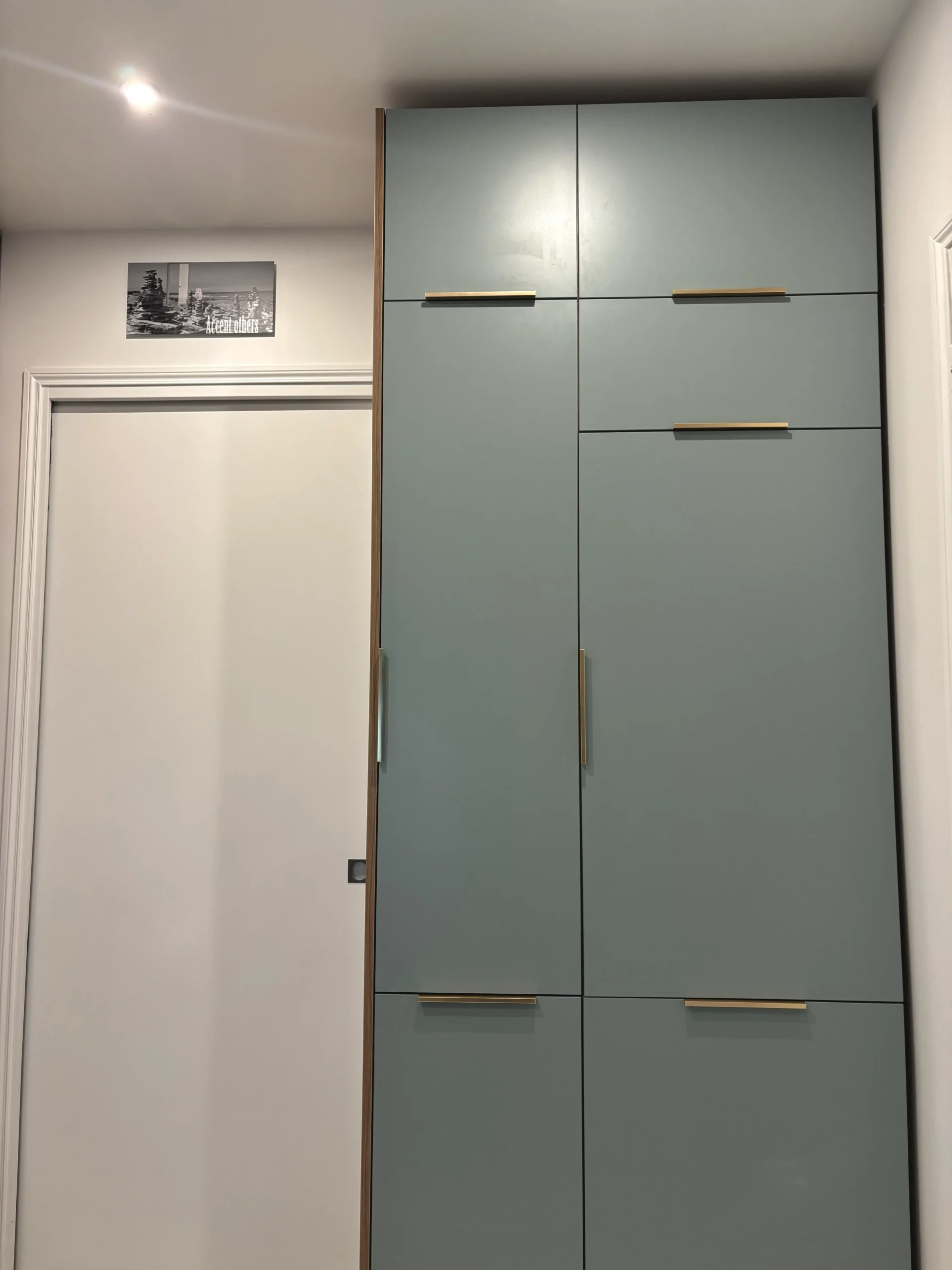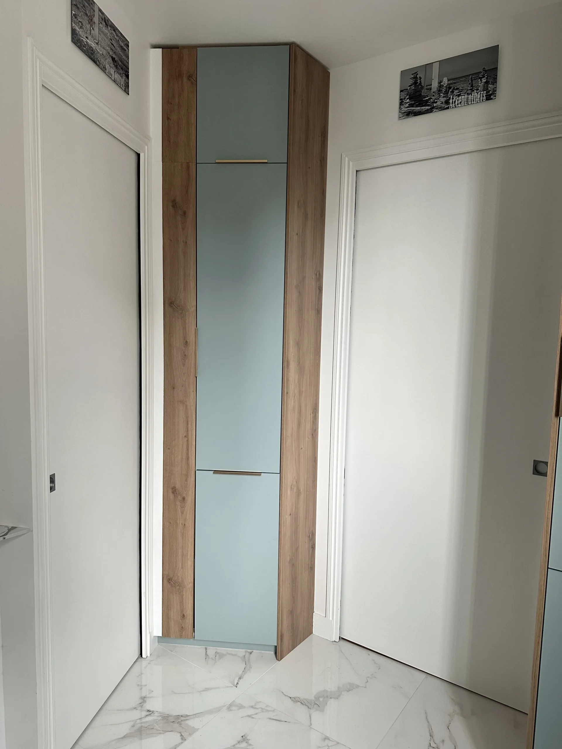J’ai aussi dessiné deux meubles sur mesure pour faire disparaître le compteur électrique et créer des rangements ergonomiques, pensés pour le quotidien.